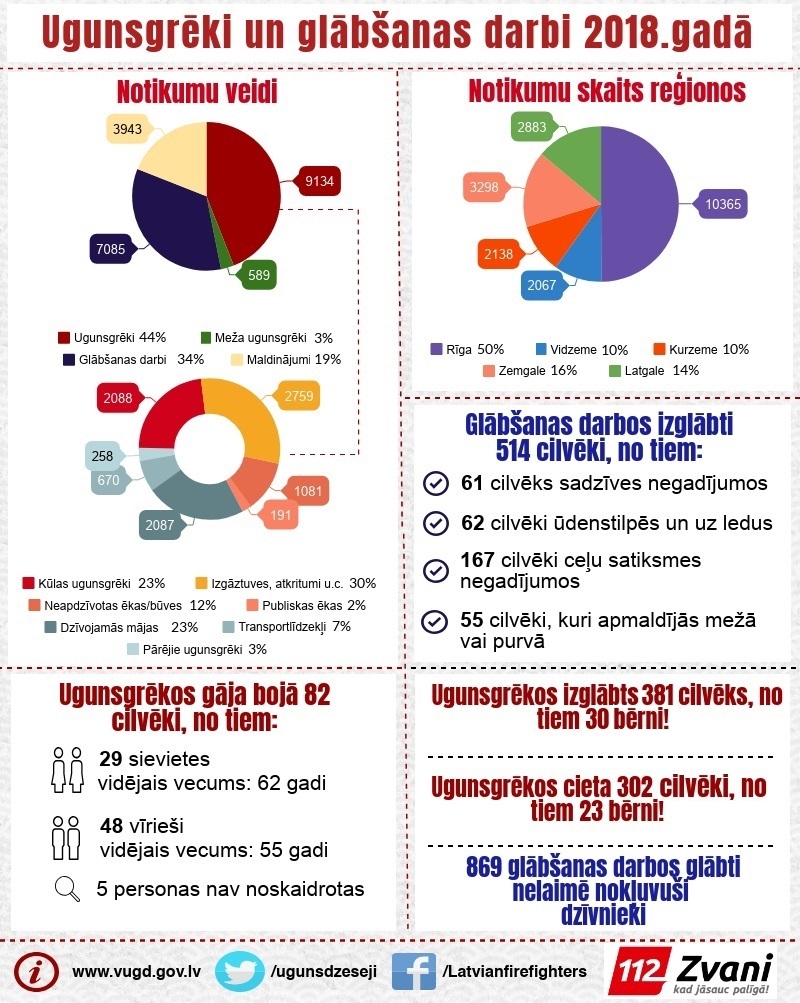 Visvairāk izsaukumu, tajā skaitā 3890 ugunsgrēki, reģistrēts Rīgā un Rīgas reģionā, no kuriem 2568 – tieši Rīgas pilsētā. Savukārt, Vidzemes ugunsdzēsēji glābēji saņēmuši vismazāk izsaukumus.